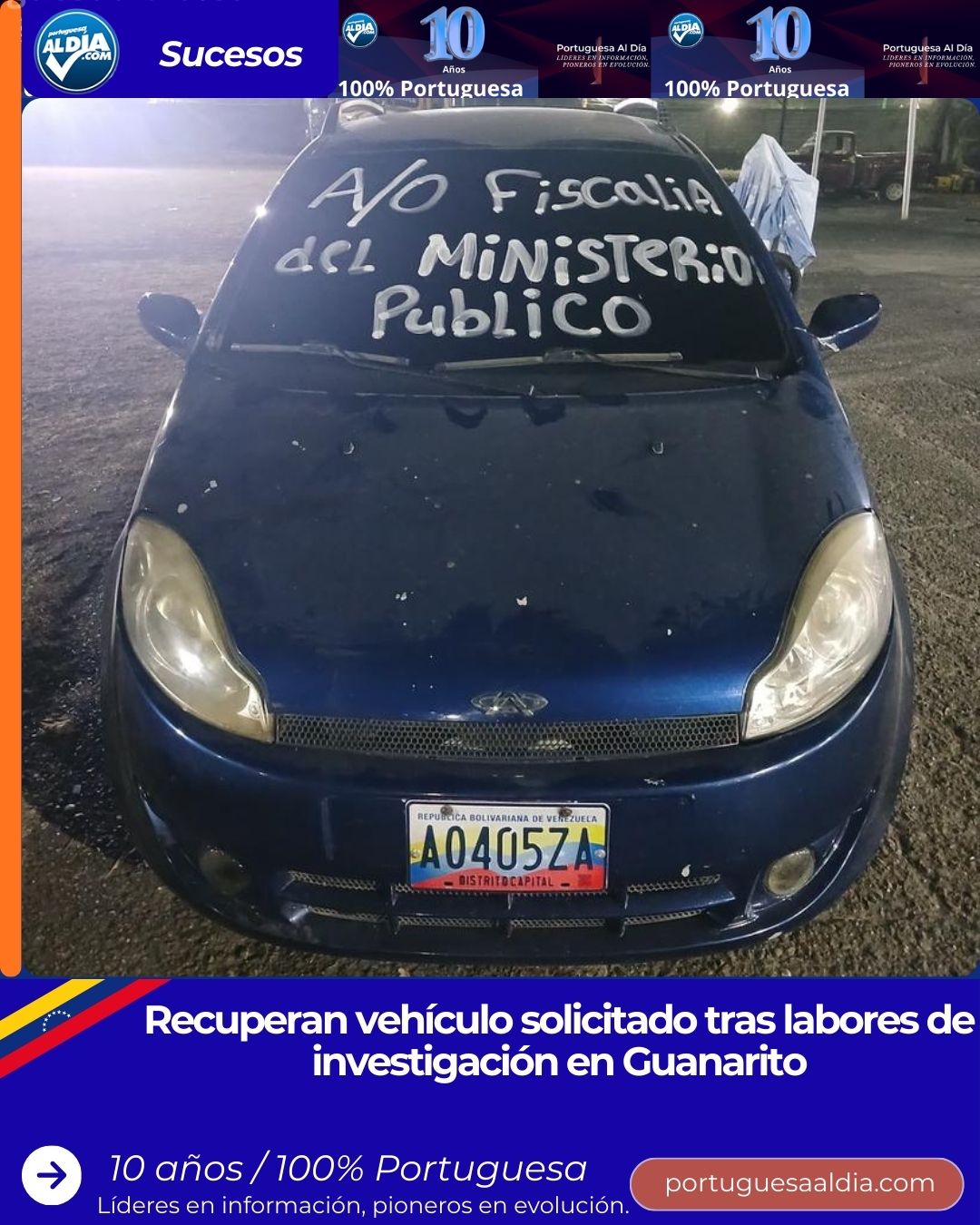 El vehículo en cuestión, un Chery Arauca de color azul, año 2015, Placa: AO405ZA (con otra placa anterior registrada por extravío), está relacionado con un delito contra la propiedad, según oficio legal. En consecuencia, quedó bajo custodia y a la orden del Ministerio Público.