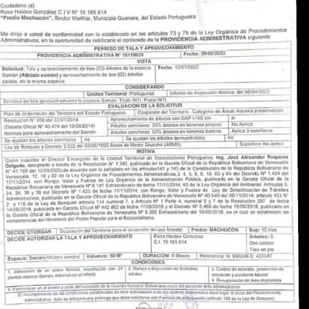 Adriano Moreno Castillo denuncia que con ese «permiso» que según esa señora que aparece en el permiso, y que es emitido por el ambiente de Guanare, realizaron esa tala aprovechándose de la especie a orillas del yacimiento. Pedimos a las autoridades competentes tomen cartas en en el asunto, pues «estoy ahí desde hace 35 años con el predio y la cooperativa Caña Blanca, sabe de todo el asunto y más el consejo comunal del caserío que dio carta de ocupación a esos ciudadanos.