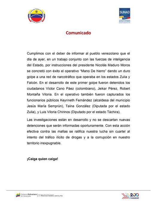 Mediante un comunicado público, el titular de la Superintendencia Nacional Antidrogas indica que Fernández fue arrestada en el marco de un operativo llamado «Mano de hierro», con el que pudieron también desmantelar una presunta red de narcotráfico que operaba entre los estados Zulia y Falcón.