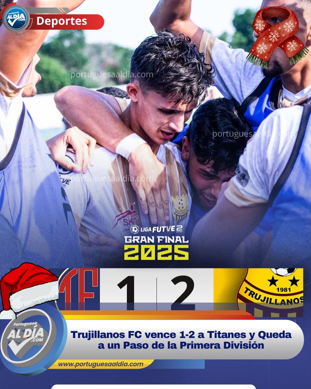 GUANARE, Portuguesa. – El Trujillanos FC dio un golpe de autoridad este sábado [08 de noviembre] al derrotar en condición de visitante al equipo Titanes con marcador de 1-2 en Guanare, en el partido de ida de la Gran Final de la Liga Futve 2. Con esta emocionante victoria, los ‘Guerreros de la Montaña’ se colocan a solo 90 minutos de concretar el tan anhelado ascenso a la máxima categoría del fútbol venezolano.