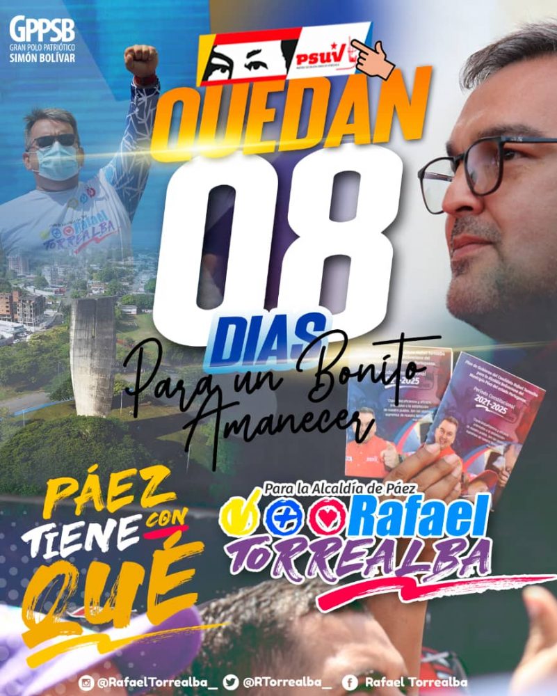 Sánchez aseveró que “estamos acompañando en la propuesta de nuestro hermano Rafael Torrealba, futuro y seguro alcalde del municipio Páez y también la propuesta de nuestro compañero Primitivo Cedeño, que no son otra cosa que en el caso de Rafael Torrealba,  la necesidad de dar respuesta en los primeros 180 días de gobierno, para llevar a cabo y acompañar la propuesta del compañero para atacar los nudos críticos que están afectando al municipio, por eso vamos a trabajar en la revisión de la ordenanza y además trabajar en la mejora de los servicios público y desde esa trinchera con ese plan de gobierno que tiene nuestro hermano Rafael Torrealba, vamos a apoyar las necesidades básicas, que él ha determinado allí en ese plan de gobierno del periodo Constitucional 2021-2025”.