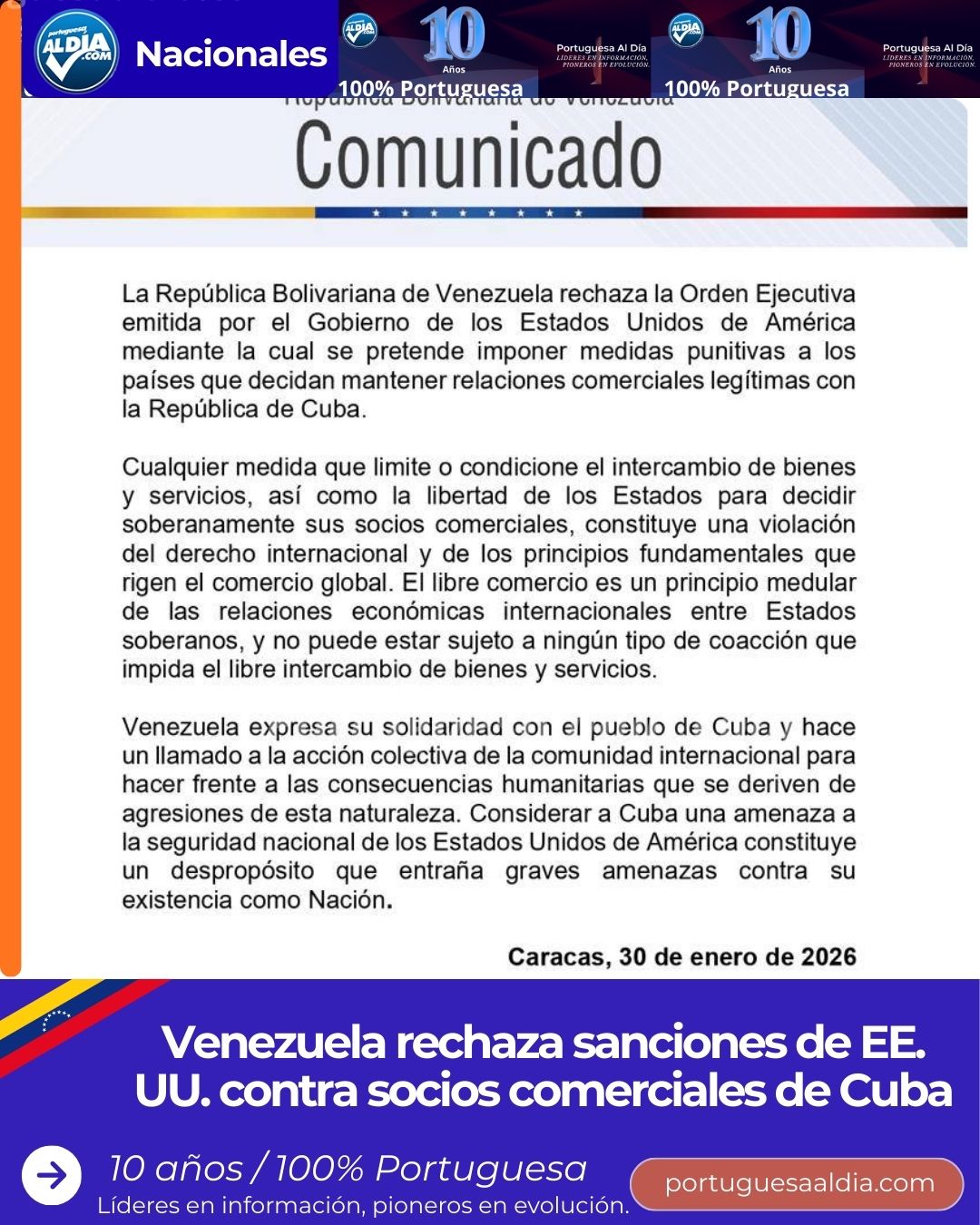La República Bolivariana de Venezuela emitió este viernes un comunicado oficial para manifestar su firme rechazo a la reciente Orden Ejecutiva del Gobierno de los Estados Unidos, la cual pretende imponer medidas punitivas a países que mantengan relaciones comerciales legítimas con Cuba. El documento, fechado en Caracas este 30 de enero de 2026, denuncia que tales acciones constituyen una flagrante violación de los principios fundamentales que rigen el comercio global y el derecho internacional, al intentar coartar la libertad de los Estados soberanos para decidir sobre sus propios socios comerciales.