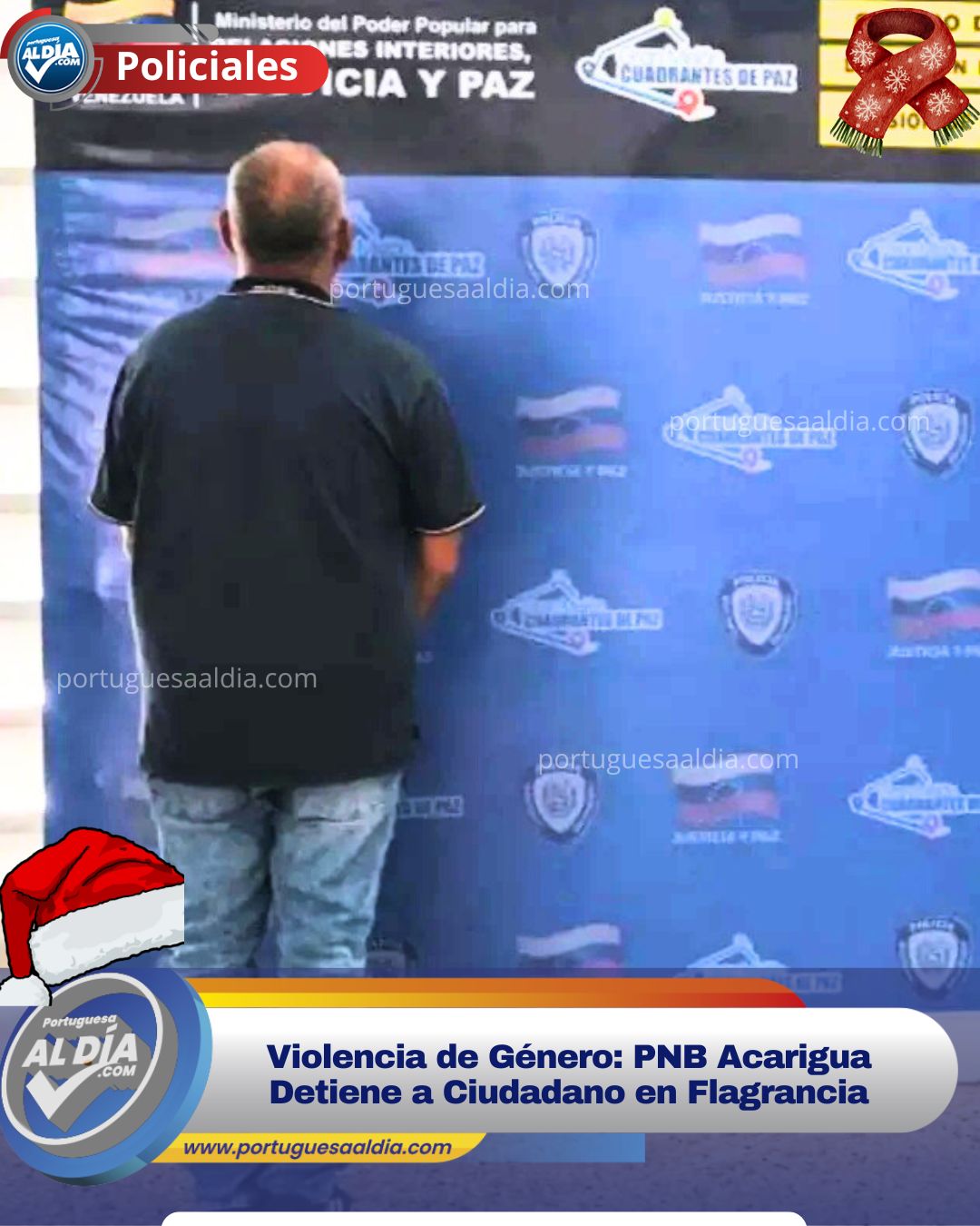 Funcionarios adscritos a la División de Investigación Penal Base Acarigua de la PNB lograron la aprehensión en flagrancia de un ciudadano por el presunto delito de violencia de género. La intervención policial se realizó en el sector Centro de Acarigua, luego de que se formalizara una denuncia en el despacho policial correspondiente.