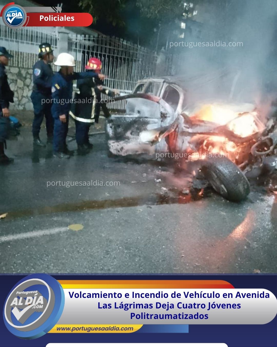 Un vehículo Chevrolet Trailblazer se volcó y se incendió en la Avenida Las Lágrimas del municipio Páez. Cuatro jóvenes resultaron politraumatizados y fueron trasladados a la Clínica Cemell, mientras bomberos controlaron las llamas.